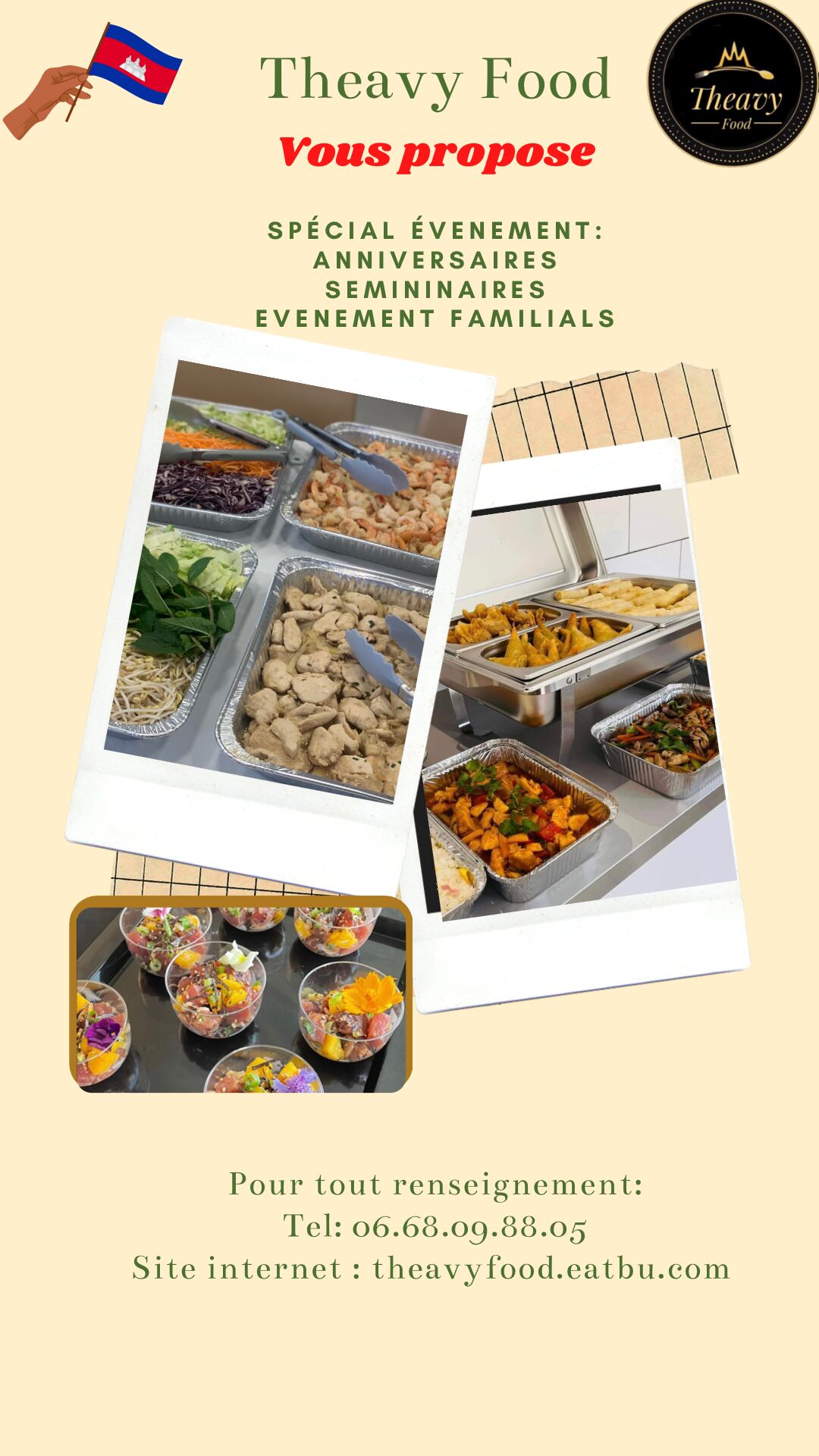 Bonjour, merci pour votre visite. Je suis traiteur Cambodgien. Je vends à emporter au marché de Thuir le samedi matin.